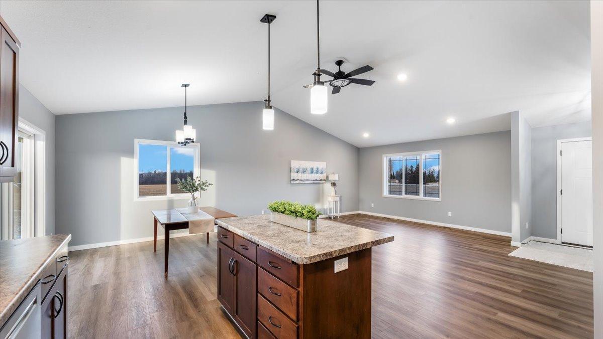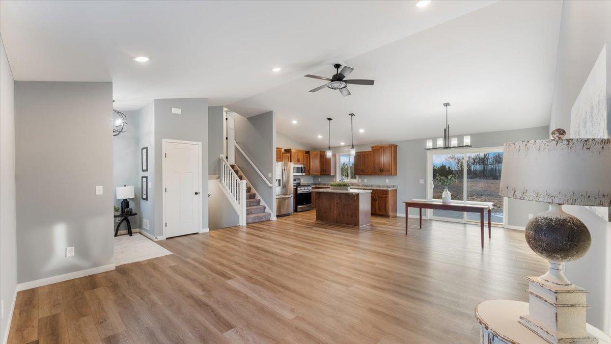 The space you seek with room to roam, appreciate newer construction on 4.95 acres in a quiet country neighborhood. Home features a welcoming asphalt drive greeting you with 4 sizable garage stalls. The space not only allows you to enjoy your outdoor hobbies, but offers storage for all those recreational toys. You will fall in love with the main floor that unveils vaulted ceilings, great windowscape and a perfect merging of kitchen, dining and large living room. Kitchen has stainless, appliances, center island, and a window with a backyard view. Dining is situated next to the double patio doors and steps out to a nice back hardscape for you summer picnics and barbeques. Living space is spacious and flexible. The flooring in the main level is the same throughout, allowing you to float your furniture into multiple arrangements. Main wall is set up for a mounted tv if you prefer. Embark to the upper level, which is a custom design that is both functional and fashionable. Two main bedrooms have walk in closets, there is a shared bath and the laundry is situated in the perfect location. A few more steps bring you to an elevated experience for your primary ownersuite. Huge window allowing natural light, vaulted ceilings, walk in closet and a dreamy bathroom with double vanity, soaker tub, and a walk in tile shower. There are two more levels that lend opportunity to build amazing equity. The 3rd level is accessible from the main level or from the garage. This level is partially framed, has in place a vanity, toilet, and shower surround to finish the 3rd bathroom. Space for the 4 & 5 bedroom or just a 4th with a sitting room. Fantastic spot here to create a lower level mudroom for those owners that have busy lives with lots of activity. The 4th level is wide open for your imagination and would be a fantastic future rec room. Here too find the mechanicals and tons of room for storage. The 4.95 acres leaves unlimited potential for accessory building and so much room to enjoy open sky with amazing sunsets. Visit to appreciate, and enjoy further descriptions on the professional photos. Seller is selling as is.