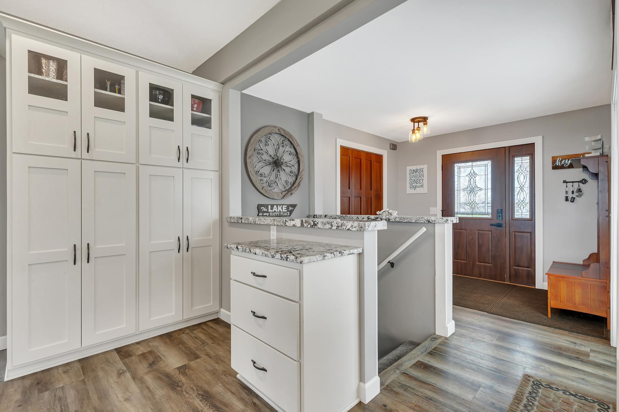 Start living the lake life you have always dreamed of! Beautiful level lot(1.01 acres) with 105ft of shoreline on Krays Lake. You will love the location of this property just minutes from town and its central location on the Horseshoe Chain of Lakes. Upstairs features open concept – Kitchen, dining, and family room with expansive windows. Beautiful custom cabinets, granite countertops, impressive center island to gather around + ss appliances w/ beverage fridge. 2 bedrooms upstairs, + bathroom with tiled walk-in shower. Lower level with additional bedroom, + potential for a 4th bedroom(needs egress), ¾ bath, family room + loads of storage space available. Extra deep 4-car garage for all your toys. Professionally landscaped lakeside with outdoor kitchen. Perfect location for the sunset! Gather around the firepit or kick back on the deck which is wired for a hot tub. Roof new 2019. Horseshoe chain of lakes offers 15 connected lakes with miles of lakeshore to explore and enjoy!